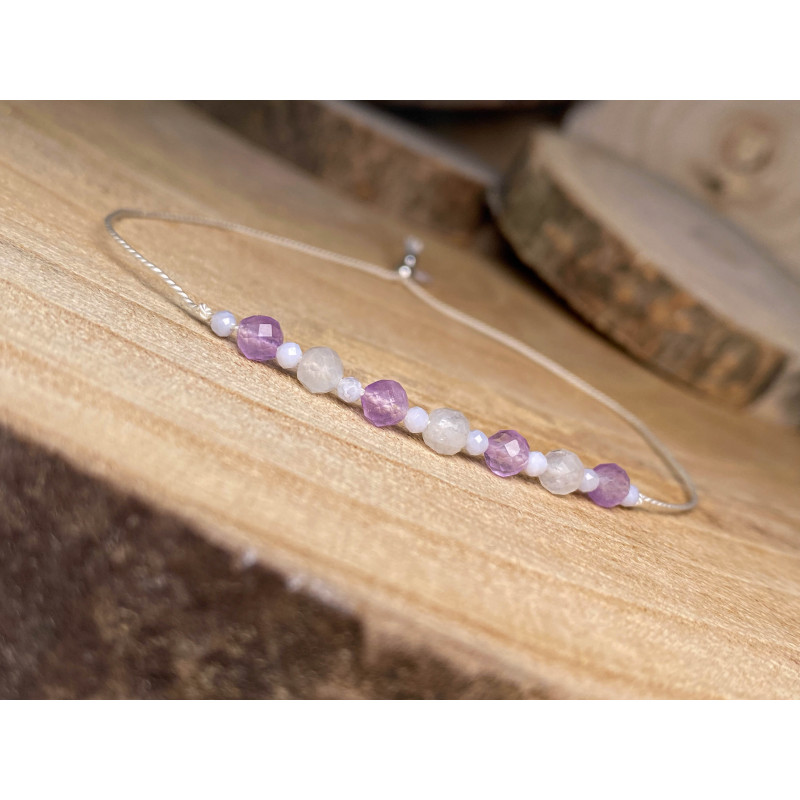Bransoletka na jedwabnej białej nici z ametystem, kamieniem księżycowym oraz chalcedonem.
