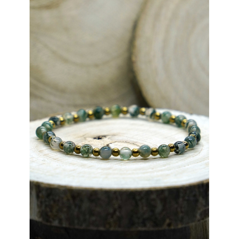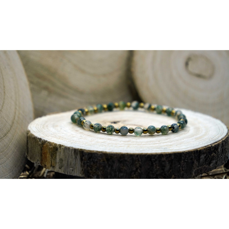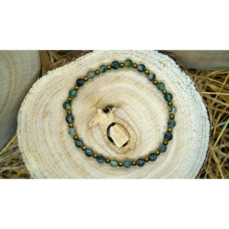 Bransoletka na gumce z agatem mszystym i hematytem w kolorze złota.