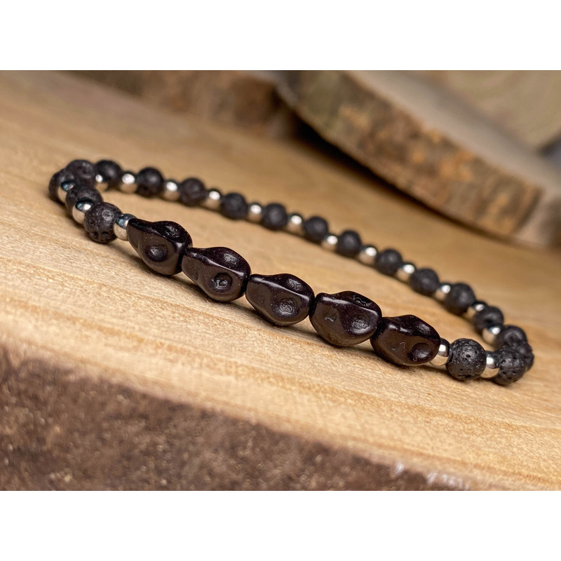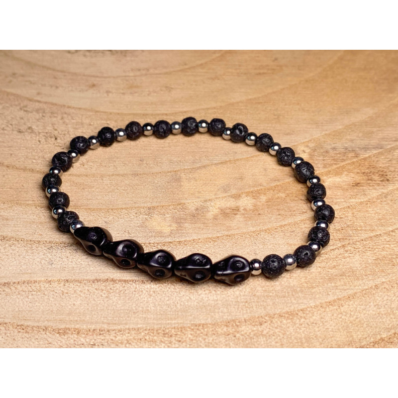 Bransoletka na gumce z czarnymi czaszkami, srebrnym hematytem oraz lawą wulkaniczną.