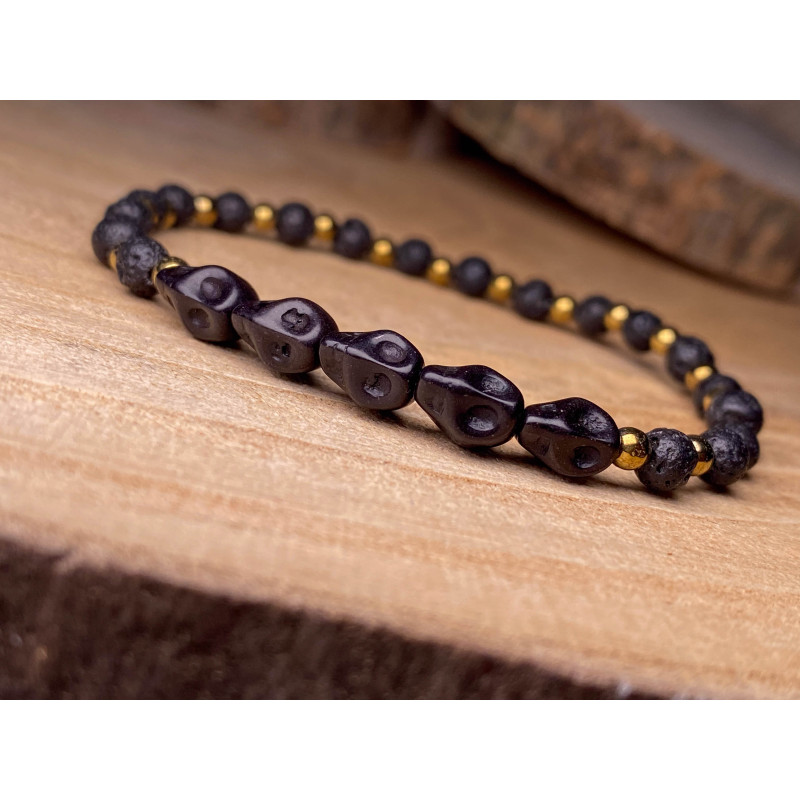Bransoletka z howlitem w kształcie czaszek z dodatkiem złotego hematytu oraz lawy wulkanicznej będzie idealnym rozwiązaniem.