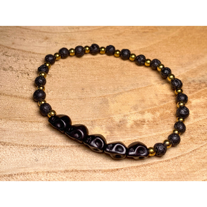 Bransoletka na gumce z czarnymi czaszkami, złotym hematytem oraz lawą wulkaniczną.