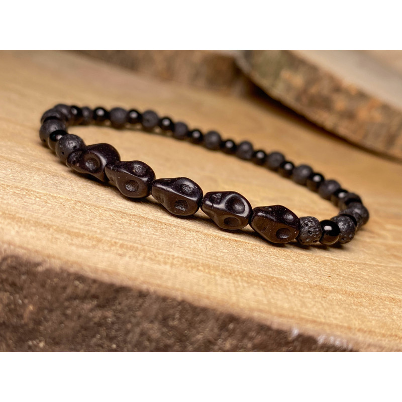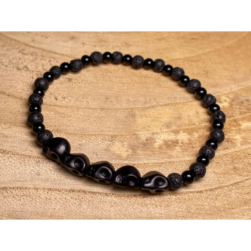 Bransoletka na gumce z czarnymi czaszkami, black stone oraz lawą wulkaniczną.