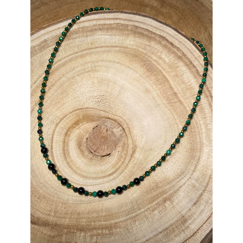 Naszyjnik z turmalinem, malachitem oraz hematytem w kolorze złota, wykończony pozłacanymi elementami.