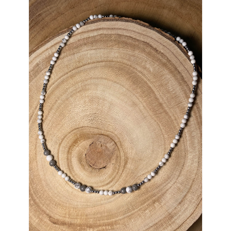 Naszyjnik z jaspisem szarym, howlitem białym oraz hematytem w kolorze srebra, wykończony srebrnymi elementami.