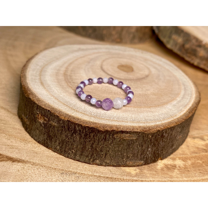 Elastyczny pierścionek z ametystem, kamieniem księżycowym oraz chalcedonem.