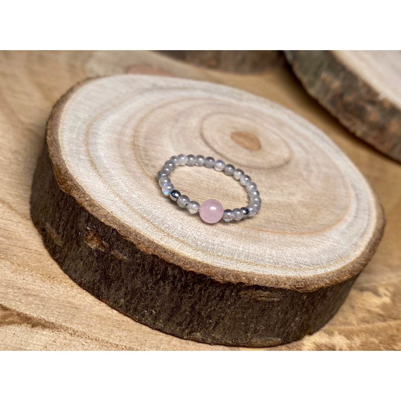 Elastyczny pierścionek z kwarcem różowym, labradorytem oraz hematytem w kolorze srebra.
